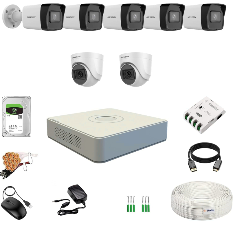 HIKVISION 8 Channel DVR with 2MP 2 Dome & 5 Bullet Wireless Cameras (DayNight Vision) + 1TB HDD + Cable Roll (1+3) 8 CH Power Supply + BNC & DC Full Combo Kit